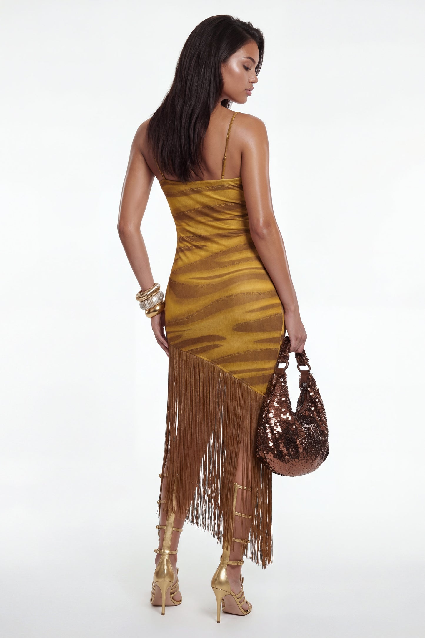 Asymmetric fringe hem.